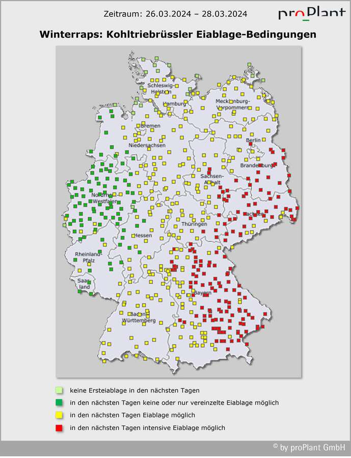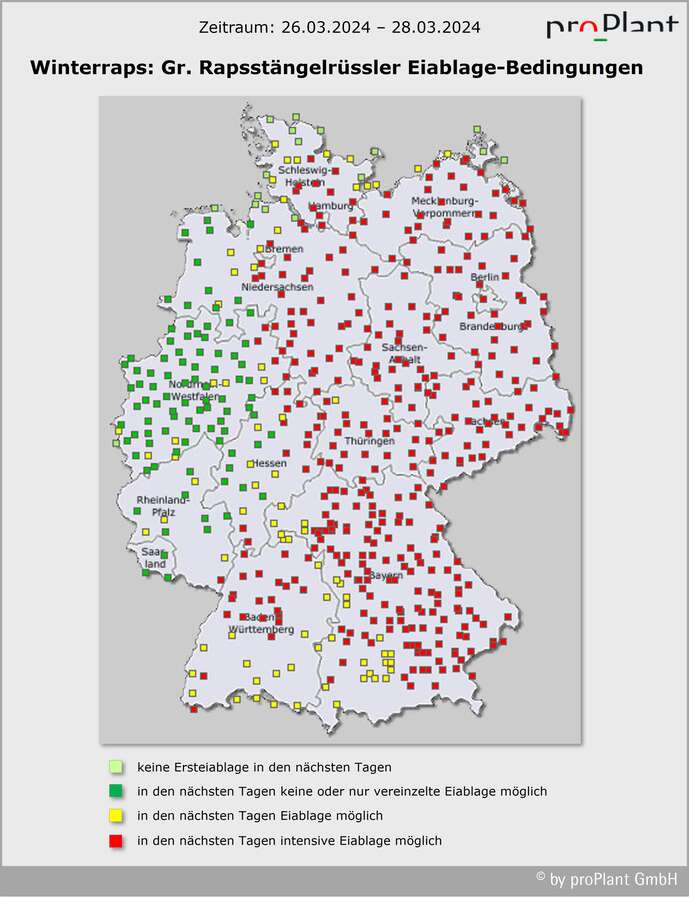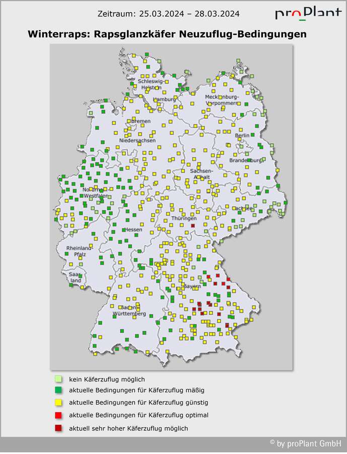 Wer Mitte letzter Woche gegen die Stängelrüssler behandelt hat, wird über die Dauerwirkung auch bis Ende dieser Woche noch zufliegende Rüssler erfassen. In den wärmeren Lagen reicht die Dauerwirkung jedoch nicht über Ostern. Im Norden Deutschlands (nördliches Niedersachsen, Schleswig-Holstein, Mecklenburg-Vorpommern) und in höheren Lagen muss noch mit weiterem Neuzuflug gerechnet werden. In dieser Woche ist besonders am heutigen Dienstag und am Mittwoch stärkerer Zuflug möglich und auch über Ostern. Erstzuflug ist im kühleren, äußersten Norden (z.B. Schleswig-Flensburg) wahrscheinlich. Gelbschalen kontrollieren und den Großen Rapsstängelrüssler umgehend behandeln, sofern es die Witterungsbedingungen erlauben. Die Situation beim Glanzkäfer mit berücksichtigen.