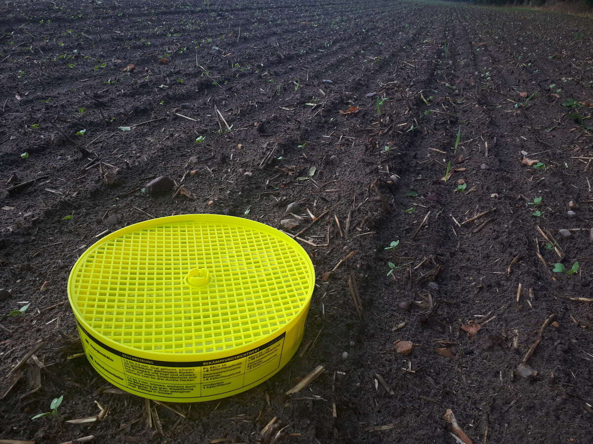 Eigene Kontrollen mit Gelbschalen sind unerlässlich! Denn der Erdflohbefall ist nicht nur regional, sondern auch von Schlag zu Schlag unterschiedlich! Eine digitale Gelbschale hilft, um die Aktivität im Blick zu haben und die Anfahrt zu planen. Eine herkömmliche Gelbschale wird zusätzlich in der Nähe platziert und zum Auszählen genutzt.