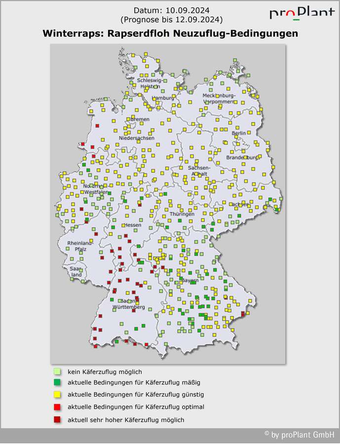 Noch hält sich der Blattfraß des Rapserdflohs in Grenzen (unter 10 % zerstörte Blattfläche). Erster kritischer Fraß wurde aus Schleswig-Holstein und Sachsen von Einzelstandorten gemeldet. 2023 war es Anfang September regional deutlich schlimmer (z.B. Schleswig-Holstein oder Sachsen-Anhalt). Der Erdfloh verursacht den typischen Lochfraß (Schnecken fressen vom Rand her oder gleich die ganze kleine Pflanze). Den jungen Raps unbedingt weiter im Auge behalten (auch bei Beizung mit einem Insektizid), besonders gestresste Bestände, die nicht richtig wachsen wollen. Wo der Schlag an Hecken oder Wald grenzt oder wo Altrapsschläge in der Nähe sind, zuerst gucken. Bei anstehenden Herbizidbehandlungen sollten keinesfalls pauschal Pyrethroide zugemischt werden; dies erhöht den Resistenz-Druck unnötig. Der Erdfloh muss in dieser Phase gezielt bekämpft werden, wenn der Fraßschaden 10% oder mehr beträgt. Zu beachten ist, dass Insektizide nicht mit allen Zusatzstoffen von Herbizidanwendungen mischbar sind (z.B. mit den Gräsermittel-Additiven Dash oder Radiamix). Häufig sieht der Fraßschaden schlimmer aus als er ist, besonders wenn der Raps wie dieses Jahr schon weiter entwickelt und wüchsig ist (die Löcher „wachsen“ mit). Dann erstmal den weiteren Zuflug abwarten.