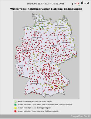 Erfolgte der Rüssler-Hauptzuflug zwischen 5. und 10. März, werden die Temperaturen ab Mitte dieser Woche den Start intensiver Eiablage dieser Käfer ermöglichen. Beim Gefleckten Kohltriebrüssler war ein Hinauszögern der Behandlung möglich. Nun umgehend handeln, um die Eiablage zu verhindern. Beim Großen Rapsstängelrüssler kommt eine Maßnahme in dieser Woche in den wärmeren Regionen schon etwas zu spät. Der Rapsstängelrüssler konnte bereits mit der Eiablage loslegen, bevor es ihm dafür vorerst zu kalt wurde. In diesen Fällen ist nur noch mit einer Teilwirkung zu rechnen.