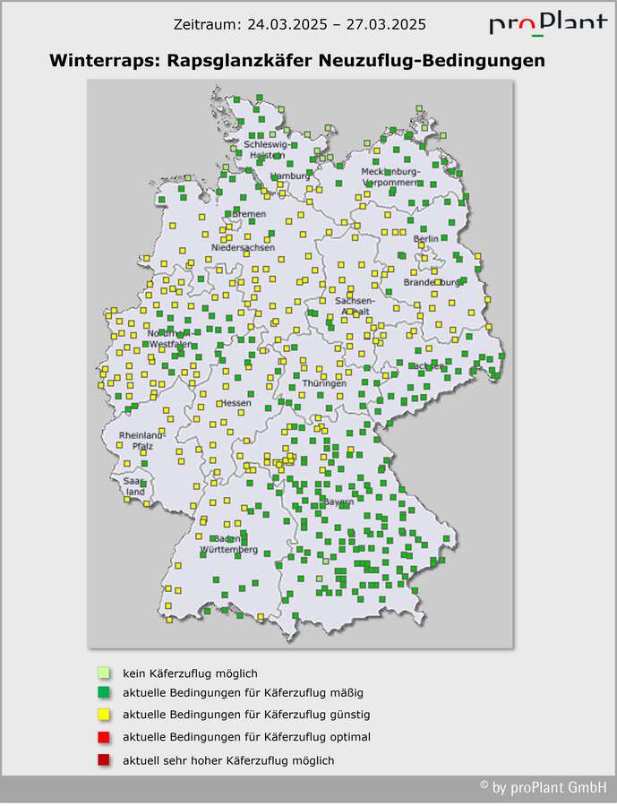 Raps in der Knospe: Falls nicht schon erledigt, die Bestände auf Befall mit Glanzkäfern kontrollieren (mehrere Knospen ausklopfen). Seit Mitte letzter Woche gab es besonders im Westen und Südwesten Deutschlands günstige bis optimale Witterungsbedingungen für Neuzuflug. Im Norden und Osten Deutschlands und in höheren Lagen fand der Käfer allenfalls günstige Bedingungen vor, bei ruppigem Ostwind am Samstag nur in sehr geschützten Lagen. Sitzen die Käfer bereits in der Knospe, werden sie sich auch von etwas kühleren Temperaturen nicht am Pollenfressen hindern lassen. Bislang wird noch nicht von kritischem Befall berichtet (>10 Käfer/Haupttrieb, bei geschwächten Beständen, z.B. durch Frost oder Rapserdfloh, >5 Käfer/Haupttrieb). Muss jetzt gehandelt werden und spielen die Rüssler keine Rolle mehr, kann im knospigen Raps bis EC59 Mospilan SG/Danjiri eingesetzt werden (solo B4-Auflage; bei Mischung mit Azol-Fungiziden B1-Auflage, d.h. es dürfen keinerlei blühende Pflanzen vorhanden sein). Mit dem Neonicotinoid ist ein Wirkstoffwechsel möglich; es ist aber nicht so leistungsstark.