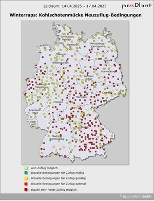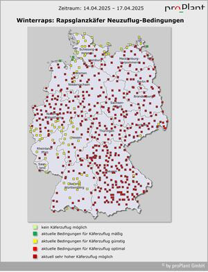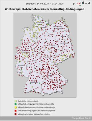 Wenn der Raps noch nicht in der Blüte ist, sollten die Bestände weiter auf Glanzkäfer-Befall kontrolliert werden (Hauptknospen abklopfen – nicht nur am Rand schauen und nicht nur an den hohen Pflanzen). Bislang ist der Glanzkäfer-Befall meistens unter der Schwelle geblieben. Beim Ausklopfen der Knospen auch auf den Kohlschotenrüssler achten. Hat die Rapsblüte begonnen, schädigt der Glanzkäfer nicht mehr. Der Fokus richtet sich auf die Blütenschädlinge (Kohlschotenrüssler und Kohlschotenmücke).