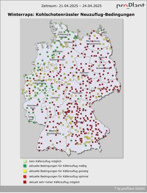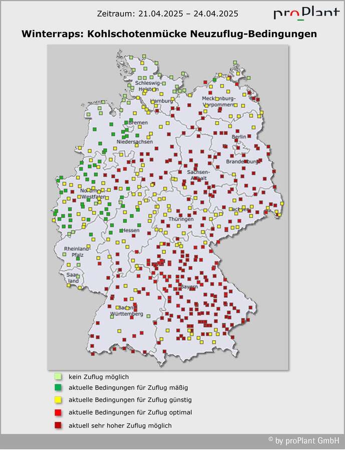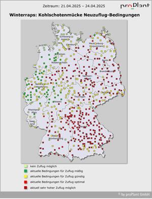 Für die Kohlschotenmücke besteht ein erhöhtes Risiko für Befall bei Starkbefall auf benachbarten Rapsflächen im Vorjahr (glasige Schoten mit Larven darin, die später aufplatzen – auch im Inneren des Schlages) und in bekannten Befallslagen. Die Mücke selbst ist sehr schwierig zu beobachten. Sie ist nur in warmen und windstillen Stunden unterwegs und schnell zu verwechseln mit den nützlichen Schlupfwespen. Letztere haben die typische Wespentaille.