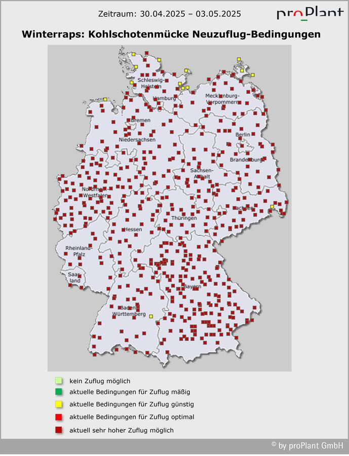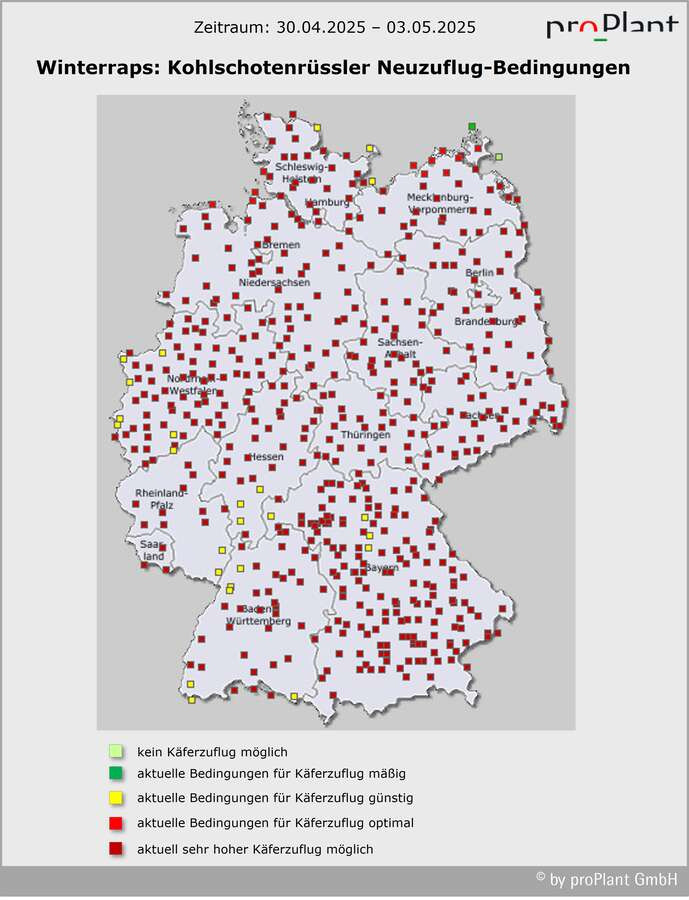Selbst bei starkem Befall mit dem Kohlschotenrüssler will ein Insektizideinsatz gegen Kohlschotenrüssler und Kohlschotenmücke gut überlegt sein: Die Situation für die Praxis ist prekär. Die einzig zugelassenen Pyrethroide wirken schlecht: Der Kohlschotenrüssler ist durch langjährigen Pyrethroid-Einsatz resistent geworden. Die Kontaktwirkung gegen die Kohlschotenmücke ist begrenzt. Die filigrane Mücke ist nur in windstillen, sonnigen Stunden unterwegs; bestenfalls trifft man nur eine von mehreren Zuflugwellen. In dieser Woche – bis Freitag – sind die Zuflugbedingungen fast deutschlandweit optimal. Gegen die Mückenlarven, die im Inneren der Schoten an den Wänden saugen, wirken die Mittel nicht. Und: Pyrethroide schaden den Nützlingen. Wenn, dann bei erhöhtem Befallsrisiko für die Kohlschotenmücke möglichst das Produkt Mavrik Vita/Evure einsetzen (max. 1x im Frühjahr). Der Wirkstoff gilt als etwas weniger schädlich für einige Schlupfwespenarten. Anwendung am Rand und abends/nachts mit Bienenschutzauflage „B4“ (auch bei Tankmischungen mit Fungiziden). Oder: Nichts machen und die Nützlinge für sich arbeiten lassen…