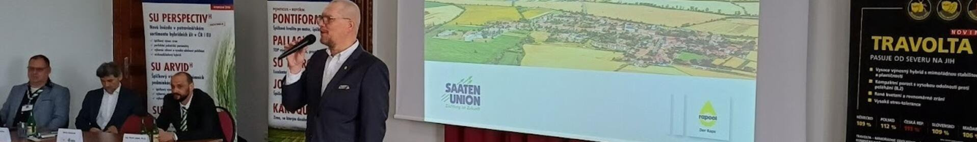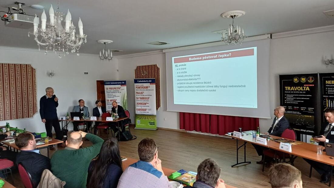 První přednáška patřila Bc. Pavlu Stárkovi, produktovému manažerovi řepek společnosti Rapool. Ten představil nové i osvědčené hybridy řepky a zároveň shrnul, jak uplynulá zima ovlivnila porosty a co čekat na jaře.