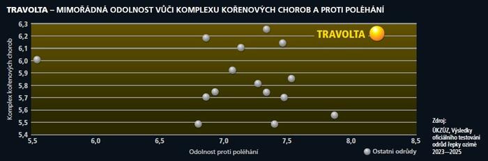 TRAVOLTA je novým členem moderní genetiky RAPOOL kombinující vysoký výnos semen s vysokou olejnatostí. TuYV rezistence, nepukavost šešulí, odolnost vůči poléhání (8,2), zimovzdornost a prošlechtěný zdravotní stav znamenají velmi dobrou výnosovou jistotu